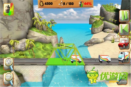 《桥梁建筑师》是一款休闲益智类的横版手游,同时适用于IOS及安卓系统。玩家在游戏中将代替生病的桥梁工程师,帮助交通部长在国庆前完成新公路的修建工作。游戏的画面比较粗糙,操作起来非常的简单,玩家直接就能上手,不过游戏看似简单,要想玩好实则不易。游戏时玩家要先建好桥梁,然后通过车辆压力测试才能过关,桥梁的抗压性、桥梁的造型都可以通过玩家的丰富想像构造出来,游戏很具有趣味性。游戏的场景比较丰富,随着游戏的进行,每关都有挑战任务供玩家选择,例如省钱模式、安全模式之类的,很考验玩家的智慧,同时难度也会越来越大,很多的挑战任务估计除了“深井冰”玩家们可以完成之外,世界无人可及,相信你玩着玩着就会喜欢上这款游戏。这款游戏是“深井冰”玩家们的必备之选,这里就是你的舞台!