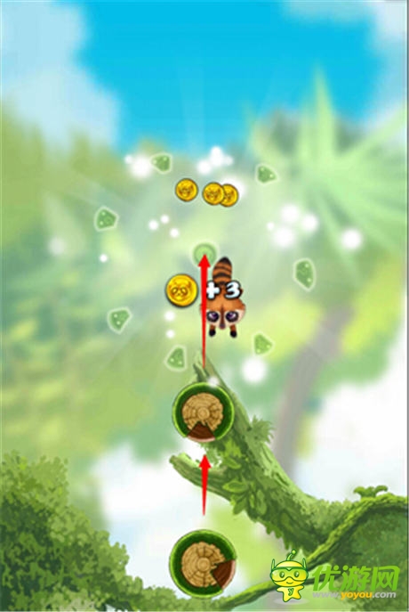 随着关卡的逐渐通关,我们会发现一些金币奖励关卡,就是如下图所看到的,我们只需要点击屏幕跳跃,这点有点类似《超级玛丽》中的顶金币的环节。当然下图中的跳跃路线已经标明了,希望对大家有用。