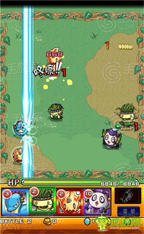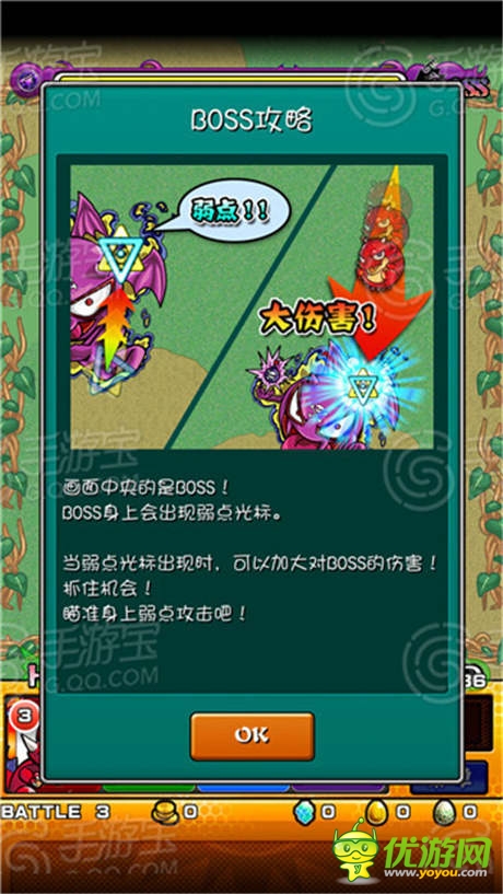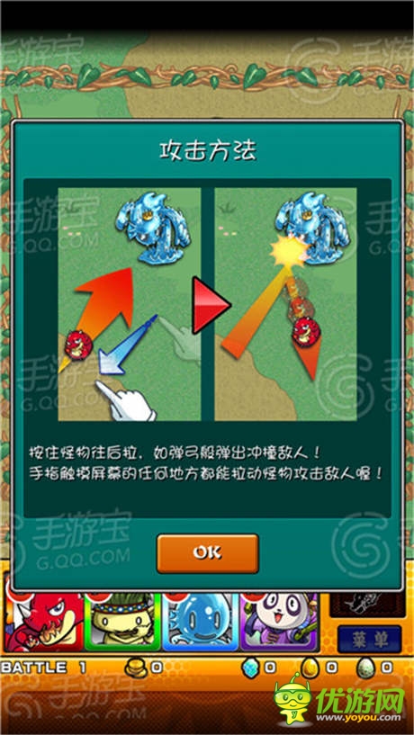 游戏的玩法比较简单,游戏的战斗模式跟弹珠或者桌球游戏非常类似,玩家可以用手触摸自己的怪物后向任意方向滑动,松手后自己的怪物就会向相反方向弹出,拖动的距离越远则怪物的速度越快。当怪物撞击敌方怪物的时候就会对敌方怪物造成伤害,通过撞击己方队友触发友情技能,以及利用不同的弹珠属性来进行不同性质的攻击,有光束、爆发、冲击波、追踪弹、扩散弹等等多种,有的时候不一定非要撞击到怪物,撞击到友军引发的友情技能反而伤害会更高,另外还有一个小技巧,我们在设定怪物弹击的方向时,并不需要点击在怪物身上,在屏幕中央一样可以设定弹击的方向哦,这样即使怪物在屏幕边缘也完全不用担心,试着在屏幕中心选择攻击方向,你会发现更容易也更轻松哦!