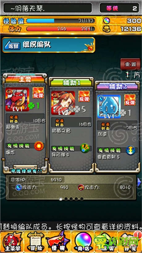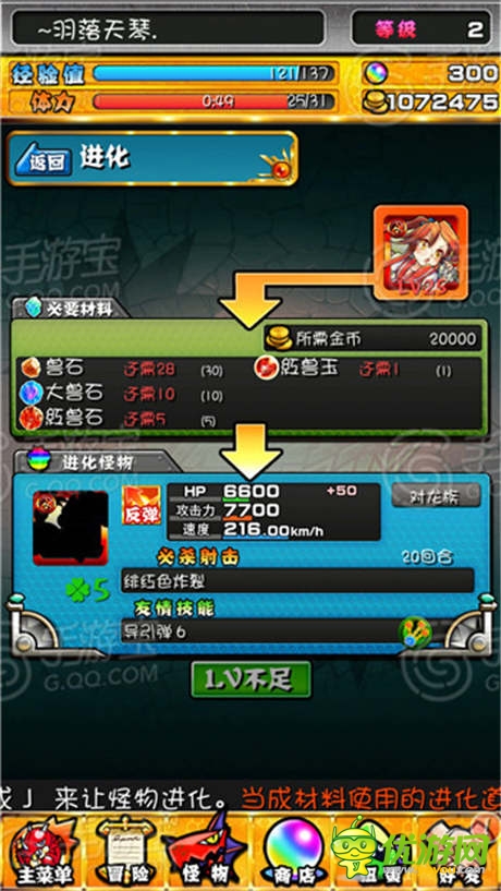 除了此核心玩法外,其余的和智龙迷城还是比较相似的,扭蛋、活动、强化、进化等等。我相信玩过卡牌类游戏的都很清楚,编队类、进化类和进阶类的系统是必不可少的,同理,在《怪物弹珠》中,强化合成也就是我们所谓的升级,选择自己想要强化的主怪和配合升级的进化材料来进行等级的提升。