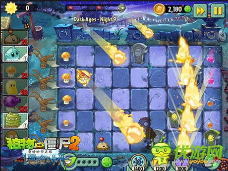黑暗时代战斗升级,植物军团的老朋友蘑菇家族将再次发力抗击僵尸入侵!不但有会成长的阳光菇、令僵尸为己作战的魅惑菇和能吸走铁器的磁力菇,还有经典寒冰菇和烈焰菇华丽升级。寒冰菇连续向僵尸发射小冰球、寒冰箭和连环霜冻攻击,还拥有制造冰窟窿陷阱的大招!而烈焰菇也获升级技能,漫天火墙贯穿上下,僵尸无奈寸步难行。