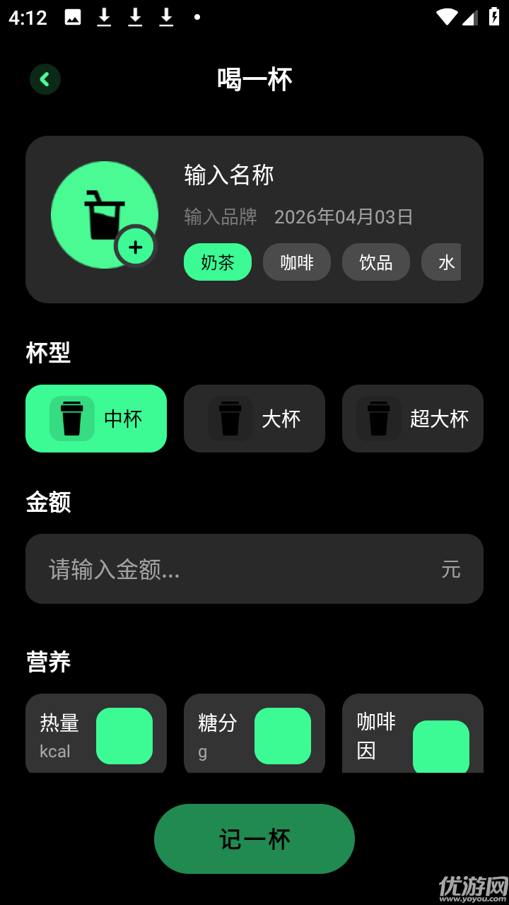4、在编辑过程中,输入奶茶名称、价格、热量等数据即可点击底部记一杯保存。
